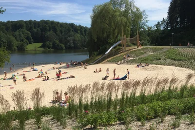 Vergnügen Sie sich in 2 mit Mineralwasser gefüllten, beheizten Becken – das größere (für Schwimmer) verfügt über eine Wasserfläche von 50 × 25 m. Sie können vom Sprungturm mit 10-m-, 7,5-m-, 5-m- und 3-m-Brett springen oder auf der rund 1,4 ha großen Liegewiese auf einem der zahlreichen Sonnenstühle entspannen. Außerdem haben Sie auf dem Freibadgelände die Möglichkeit, Beach-Volleyball, Fußball oder Tischtennis zu spielen.