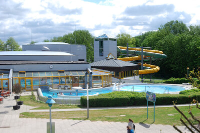 Freuen Sie sich auf ein helles, modernes Freizeitbad in warmen Farben mit eigenem Baby- und Kleinkinderbereich. Ältere Kinder und Erwachsene kommen an der Kletterwand oder auf der Black-Hole-Rutsche mit Blitz- und Donnereffekten und Sternenhimmel auf ihre Kosten. Zudem bietet der AquaPark mit seinem 25-m-Schwimmbecken, einem Erlebnisbecken mit Whirlpool, dem Außenbecken mit Wasserpilz und Sog sowie einem Gastronomiebetrieb für alle Badegäste ein vielfältiges Angebot.