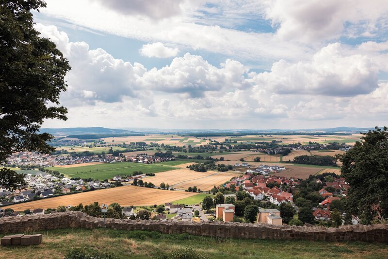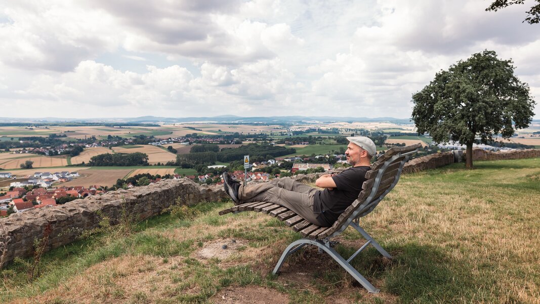 Zum Abschluss der Tour streife ich auf einem schmalen Wiesenpfad vorbei an Brombeersträuchern und grasenden Schafen. Mein Ziel ist die Obernburg, die Ruine einer alten Höhenburg. Von hier lasse ich in aller Ruhe den Blick ins Weite schweifen. Ich betrachte noch mal die Wälder, Wiesen und Hügel, durch die ich gewandert bin. Die Aussicht bis hin zum Kaufunger Wald und Kellerwald führt zusammen, was ich heute erlebt habe: die stille Landschaft mit ihren Basaltkuppen und weiten Feldern. Und die Kunst in Form eines großen gestalteten „G“s, das mir hier oben begegnet.