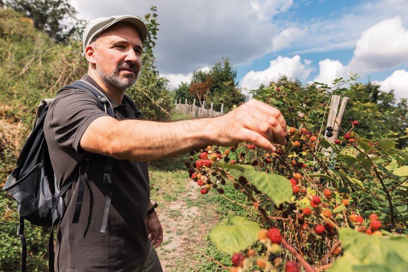 Ich steige aus dem Bus und mir fällt auf: Meine innere Uhr tickt bereits ein Stück langsamer. Dieses angenehme Zeitgefühl wird mich heute den ganzen Tag begleiten. Am Anfang des Wegs liegt die Traditionsbäckerei Schwarz. Hier stimme ich mich mit einem Stück Johannisbeer-Baiser auf den Tag ein und nehme mir noch ein Baguette mit für unterwegs. Der Weg führt hinein in die Felder und Streuobstwiesen der Umgebung. Die Straße wird zum Landweg, der Landweg zum Pfad. Im Laufe des Tages teilen sich die Wolken und geben die Sicht frei auf den blauen Himmel. Mein Blick folgt den Telegrafenmasten oder einer Linie von Bäumen bis zum Horizont.