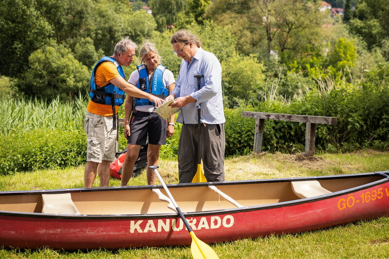 Von der Bushaltestelle sind es nur wenige Schritte bis zum Startpunkt. Der Weg führt über die Brücke und beim Blick ins klare Wasser wächst die Freude auf unser Abenteuer. Das beginnt damit, dass Manfred auf der Karte zeigt, was uns auf der Strecke erwartet. Im Boot kniend macht er uns vor, wie der Kanadier traditionell gefahren wird – wir sitzen später dennoch lieber auf den Holzbänken. Die Instruktionen zum Steuern und zum möglichst trockenen Ein- und Aussteigen hält Manfred kurz: „Auf dem Wasser habt ihr sowieso alles vergessen.“ Was zumindest auf den ersten Metern stimmt.