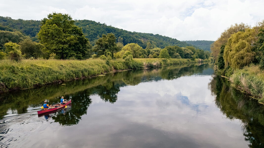 In die Natur und einen meditativen Modus eintauchen – das geht bei einer Paddeltour auf der Werra. Bei der Talfahrt begleiten uns Eisvogel und Fachwerk.