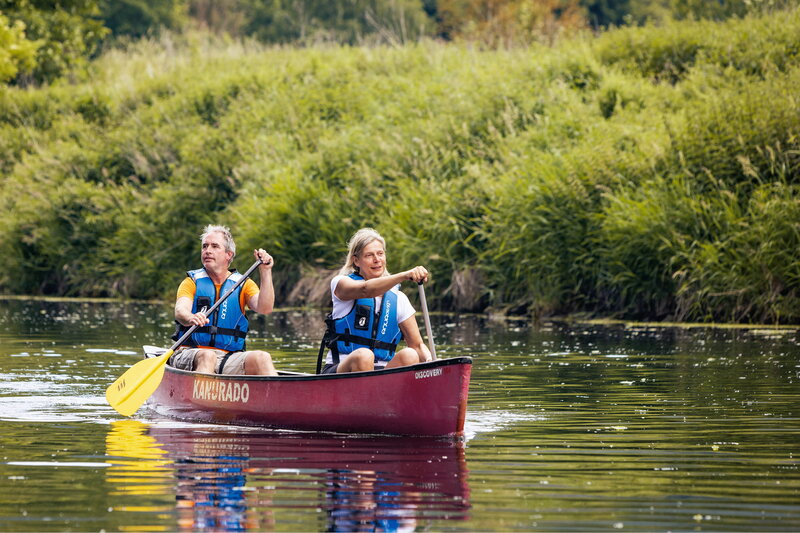 Die Bugwelle plätschert leise, unterm Boot wogt meterlanges Pflanzengrün in der Strömung. Unsere Paddel stechen ins klare Wasser. Die gleichförmige Bewegung und das Dahingleiten auf dem Fluss schalten das Denken ab. Bis wir so im Flow sind, brauchen wir einige Kilometer, um das Kanu auf Kurs zu bringen. Am Anfang kreiseln wir übers Wasser und steuern mit Bremsmanövern dagegen. Elegant geht anders. Nach einigen Ausflügen in die Schilfböschung erinnern wir uns an die Tipps unseres Bootsverleihers Manfred Weick von Kanurado: Wer hinten sitzt, drückt das Paddel am Ende des Schlags nach außen. So läuft das Kanu geradeaus. Vorne lässt sich der Kurs korrigieren, indem das Paddel starr voraus in der gewünschten Richtung eingetaucht wird.