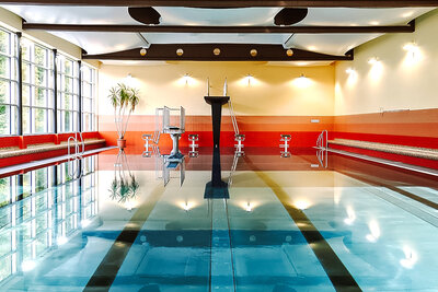Das Hallenbad verfügt über einen Nichtschwimmerbereich mit Baby und Kleinkinderzone, Sprudelliegen, 25-m-Schwimmerbecken mit 4 Bahnen sowie ein 1-m-Brett und einen 3-m-Sprungturm. Du kannst über einen Aufzug das Bad barrierefrei erreichen, auch der Sanitärbereich ist barrierefrei.