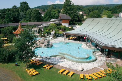 Die Kurhessen Therme verfügt über 1200 qm Wasserlandschaft innen und außen, Liegewiese mit Blick auf die Wasserlandschaft, Wasserfälle, Whirlpools, Saunalandschaft mit 8 Themen-Saunen, Dampfbad, Damensauna und einen großen Sauna-See. Wellness in 8 Oasen mit 5 Duft-Tempeln, Entspannung in Dampfbädern, Kristall-Tempel, Marmorbad, Klang- und Relax-Tempel und vieles mehr. Der Kurhessen Therme angeschlossen sind ein Restaurant mit Biergarten und eine Boutique.