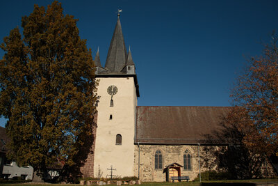 Vermutlich stammen die ältesten Teile der Kirche bereits aus dem 12. Jahrhundert, als an gleicher Stelle wohl eine kleine Kapelle stand. Über ihren Fundamenten wurde später ein Turm mit grobem Mauerwerk errichtet, der wahrscheinlich zu Wehrzwecken diente. An diesen Turm wurde dann das heutige gotische Kirchenschiff in mehreren Bauphasen angebaut. Eine Besonderheit der Kirche sind die einzigartigen Wandmalereien im Chorraum sowie das Deckengewölbe aus dem Jahr 1509, die einige Jahrhunderte übermalt waren und erst im 20. Jahrhundert wieder freigelegt wurden.