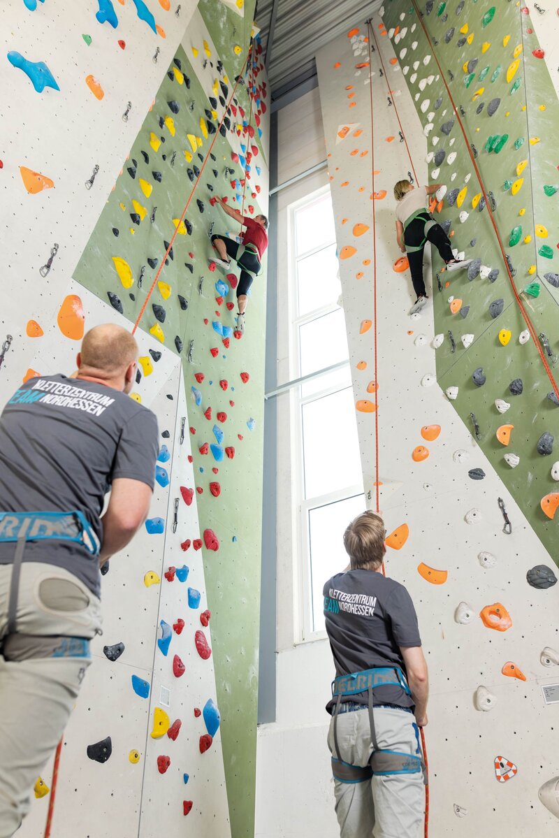 Links und rechts von uns wird mit weniger Bedenken, trainierten Muskeln und besserer Technik geklettert. Viele kommen zu zweit und wechseln sich beim Sichern ab. Wir staunen über die Fortgeschrittenen, die auch die Überhänge meistern. Eine Kindergruppe ist das erste Mal da – und einige klettern gleich bis zur Decke. Eine junge Frau fährt im Rollstuhl bis zur Wand. Sie zieht sich an den Griffen hoch, Assistierende setzen ihre Füße auf die Tritte. Und nebenan übt eine Gruppe den Vorstieg, bei dem das Seil in Karabiner an der Wand eingehängt wird.