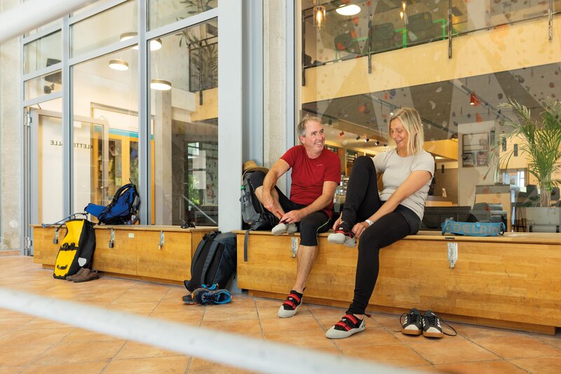 Das Probeklettern startet für meine Begleiterin und mich mit der Wahl der passenden Schuhe.
