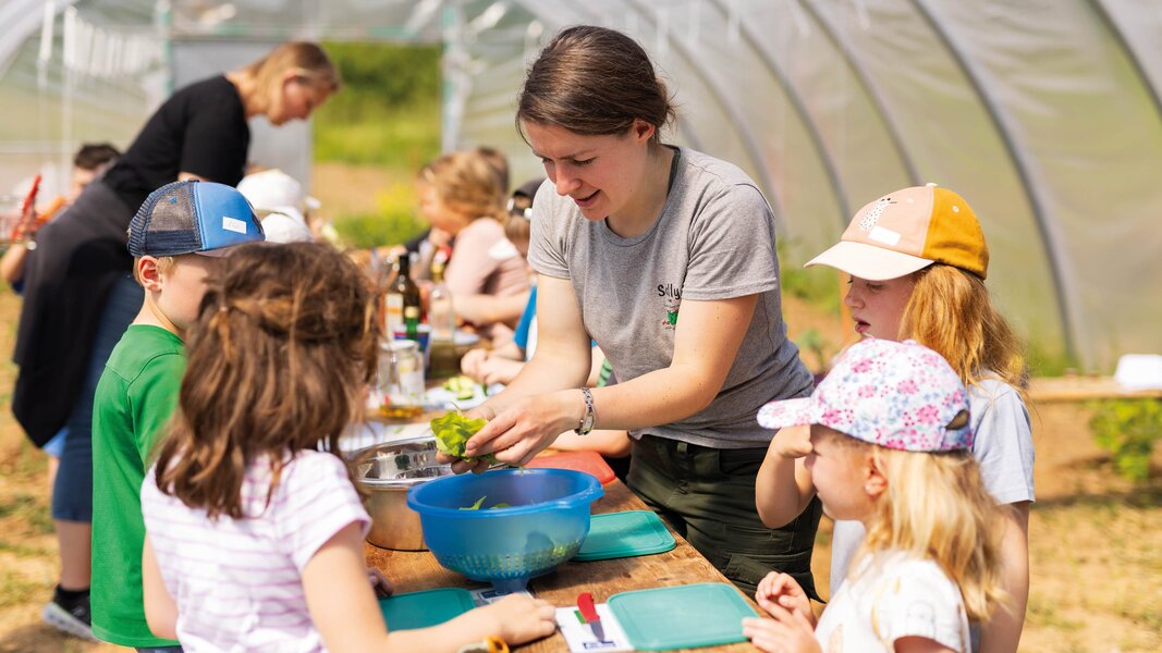 Heute sind Vorschulkinder mit dem Bus aus einem Nachbarort gekommen. Für sie ist es bereits der fünfte Besuch bei Sally und auf sie warten noch drei weitere Tage. Manche Kinder beichten, dass die Pflanzen, die sie beim letzten Mal mitgenommen haben, „leider kaputt gegangen“ sind. Im Gewächshaus ist es heiß, die Kinder schwitzen zwischen den Tomaten-, Zucchini-, Paprika- und sogar Physalis-Pflanzen. Nicht immer identifizieren sie die Pflanzen korrekt, auch Birnen und Äpfel vermuten die Kinder im Gewächstunnel.