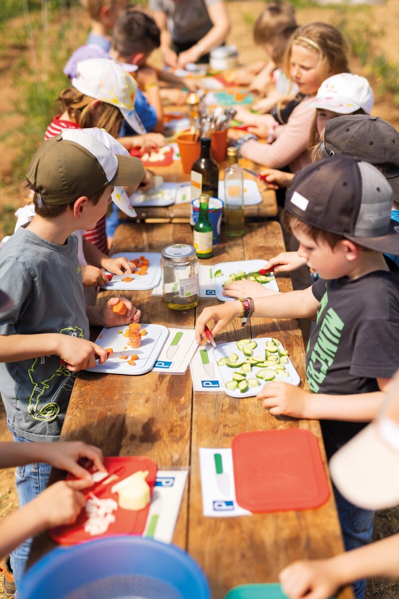 Kein Kind schneidet sich. Sally ist überall. Schließlich ist auch ein Dressing aus Joghurt, Zitronensaft, Öl, Pfeffer und Salz gerührt. „Achtung, hingucken beim Rühren!“ und „Schnell den Hahn zudrehen, nicht so viel Wasser weglaufen lassen!“ Endlich ist alles fertig, die Kinder tragen den Tisch in den Schatten hinaus, setzen sich mit ihren Tellern auf die Wiese. Die Erzieherinnen staunen, viele essen im Kindergarten nie Salat. Hier schon. Plötzlich muss es schnell gehen. Der Bus kommt bald und alle Rucksäcke und Trinkflaschen liegen noch verteilt herum. „Tschüss, Sally“, „Bis zum nächsten Mal!“ Im flotten Marsch gehen die jungen Küchenhelferinnen und -helfer zur Haltestelle an der Straße. Sally wirkt zufrieden, aber ein wenig heiser…