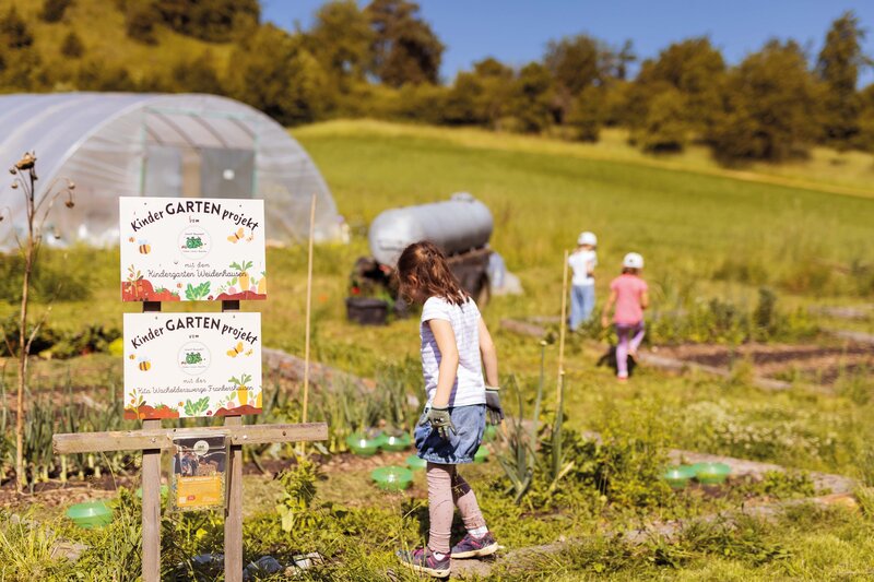 Sie greift in eine Schüssel und legt wieder etwas Grünzeug in jede kleine Hand. Diesmal ist das Ergebnis unklar: „Kohlrabiblatt?“, „Salat!“ Sally löst auf: „Asiasalat war das. So sieht der aus.“ Konzentriert geht es weiter. Die Kinder fühlen, riechen, kauen. Dann: „Sally, darf ich ausspucken?“ – „Einen Moment noch!“ Die letzten Finger legen sich auf die kleinen Nasen. „Was habt ihr bekommen? Eins, zwei und drei!“ „Schnittlauch!“ „Frühlingszwiebel!“ „Sally, darf ich ausspucken?“ „Ja, wer mag, darf jetzt ausspucken. Aber drüben auf die Wiese, hier laufen Leute.“ Noch schnell ein Schluck aus den Trinkflaschen. Dann geht es in den Folientunnel.