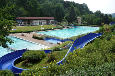 Das beheizte Waldschwimmbad finden Sie im idyllischen Heienbachtal. Rund um die Schwimmbecken laden gepflegte Liegewiesen mit sonnigen und schattigen Plätzen zum Verweilen ein. Ein Kinderplanschbecken (Spielbach von 12 m Länge, Strandbereich, Rutsche), ein Nichtschwimmerbecken (Kleinrutsche, Strandbereich, Wasserpilz, Bodenblubbler), eine Großwasserrutsche (ca. 72 m), ein Edelstahl- Schwimmerbecken (50 m) und ein 1- und 3-m-Sprungturm sorgen für die nötige Abkühlung bei sommerlichen Temperaturen. Ein Spielplatz und eine Spielwiese bieten Abwechslung, für das leibliche Wohl sorgt ein Kiosk mit sommerlichen Spezialitäten.