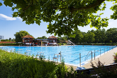 Spaß und Entspannung finden Sie auf der großen Spiel- und Liegewiese, außerdem können Sie auch Minigolf, Tischtennis oder Beach- Volleyball spielen. Spezielle Veranstaltungen (Kirche im Bad, Musikveranstaltungen, Aquafitness-Kurse, Schaumparty etc.) und die Gastronomie mit Sonnenterrasse runden das Angebot ab. Es stehen ausreichend kostenlose Parkplätze und geeignete Fahrradständer zur Verfügung. Das Freibad ist mit dem bestehenden Radwegenetz sehr gut angebunden.